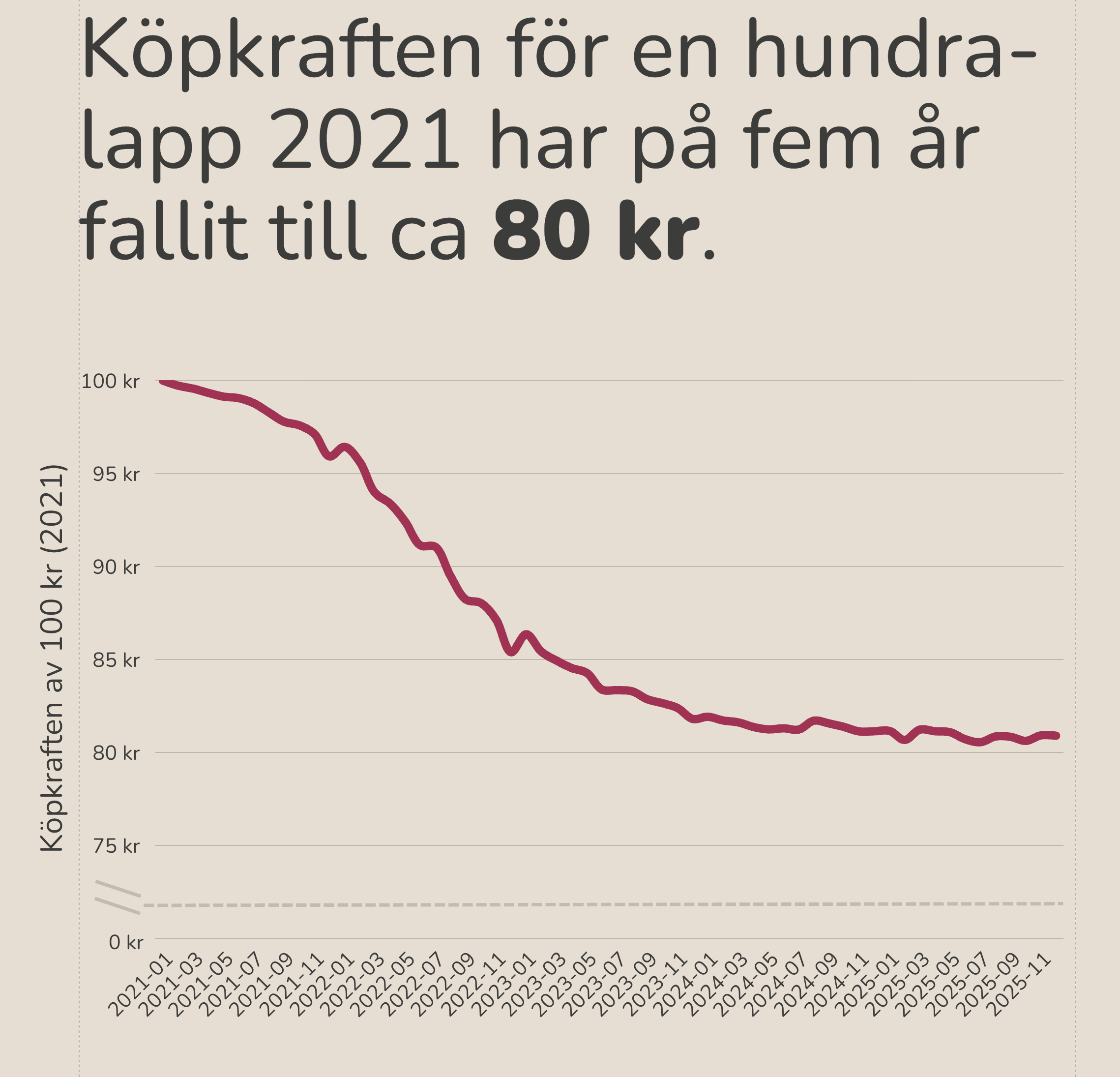 Problemet med bruten skala är ju att man visuellt förmedlar något som inte stämmer. Texten säger att “Köpkraften för en hundralapp 2021 har på fem år fallit till ca 80 kr.”, medan bilden vid första anblick säger att köpkraften har mer än halverats. Jag tror att många människor inte har kunskapen eller intresset att fördjupa sig i grafen för att tolka den rätt, utan man stannar vid den tolkning som första anblicken gav.