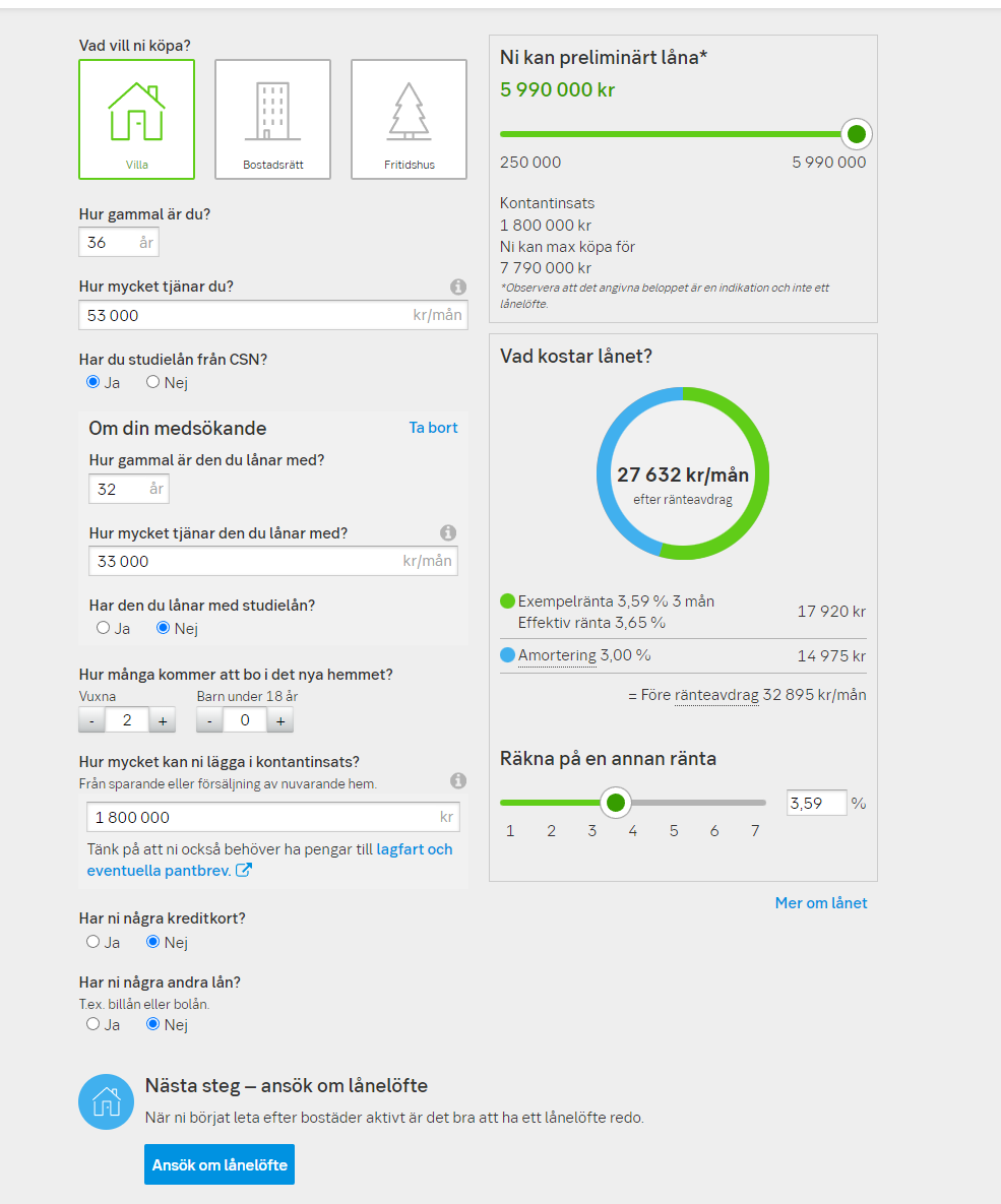 Ok, slå in 2 personer utan barn, med 45000 i lön, födda 1990, som vill köpa villa med 1,5M kontantinsats och betalar 1800kr CSN varje månad i Skandias kalkylator. De får låna 6,6x årsinkomst till en belåningsgrad av 83 %.