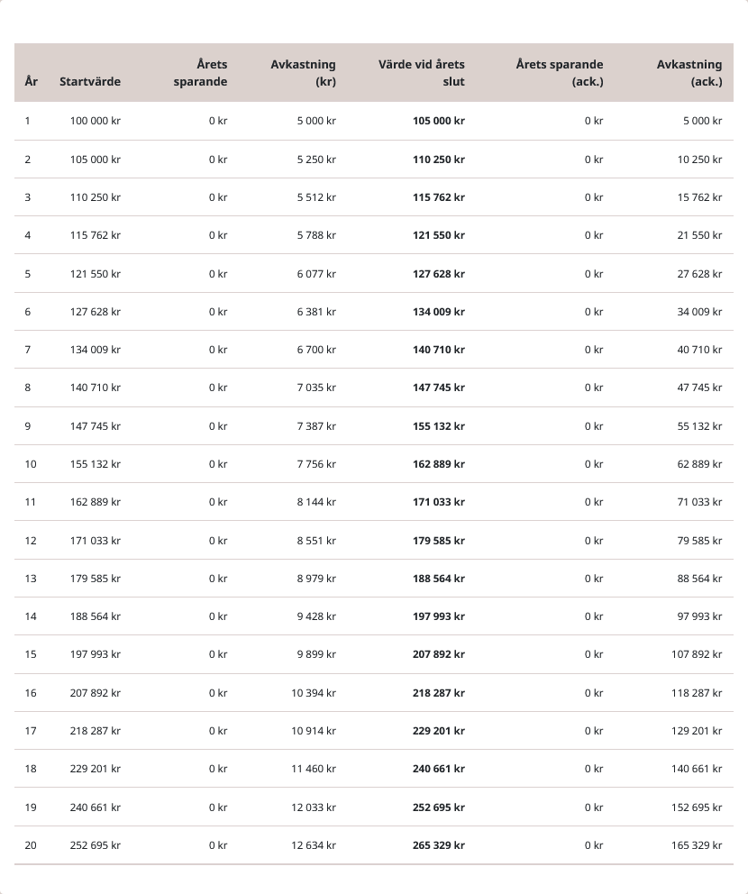 Tar du hänsyn till ränta-på-ränta-effekten så får du med 5% årlig reell avkastning istället 265 329 kr efter 20 år. Då får du också ta hänsyn till att 5% historiskt sett är försiktigt räknat.