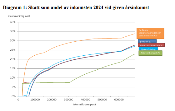 Tyckte även denna kurva var rolig ur en bra rapport från skatteverket som har all data. Grafen visar att på de första 325tkr betalar du bara 8% skatt Pension och skatt | Pensionsmyndigheten
