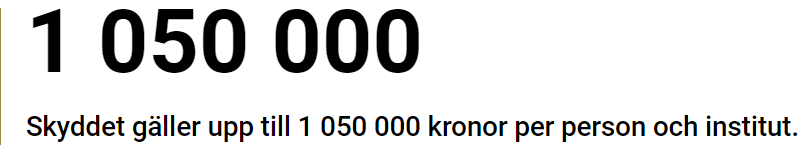 “I vissa fall kan en insättare, som har mer än 1.050.000 kronor på ett inlåningskonto i en bank/institut, ha rätt till ett tilläggsbelopp ur den statliga insättningsgarantin. Lagen anger att en insättare kan ha rätt till ett tilläggsbelopp på upp till 5 miljoner kronor för insättningar som är kopplade till vissa i lagen angivna livshändelser, exempelvis försäljning av privatbostad, försäkringsutbetalning, upphörande av anställning, bodelning, pension, sjukdom, invaliditet eller dödsfall.” Källa: Swedbank.