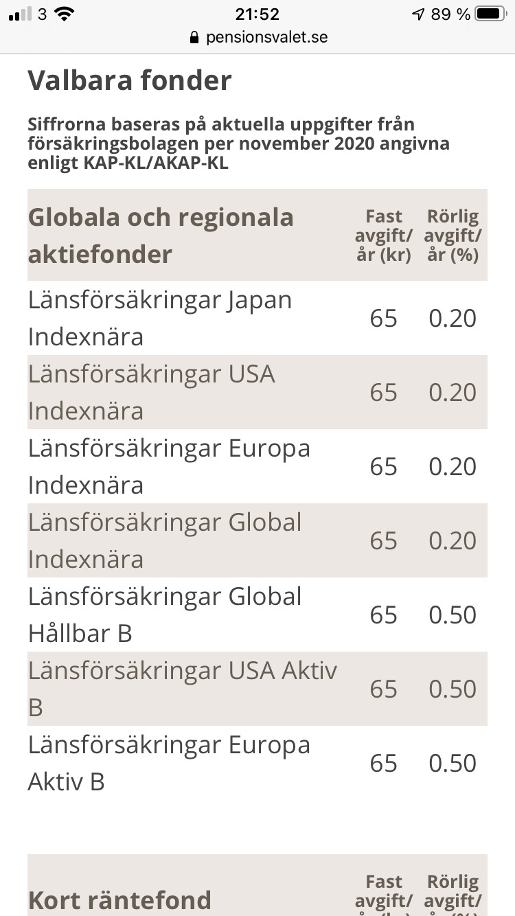 Jag har valt LF-global index och LF Sverige index. Båda har en avgift på 0,20% vilket jag tycker är bra.