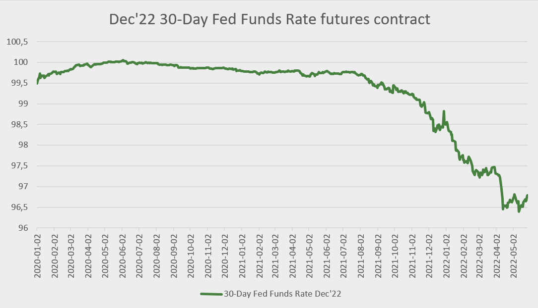 Som proxy för marknadens förväntningar på riskfria räntan, använder jag priset på ett futures-kontrakt för 30-Day Fed Funds Rate med förfall i december 2022. Detta kontrakt visar alltså vad marknaden förväntar sig att Fed:s styrränta kommer att vara i december 2022.