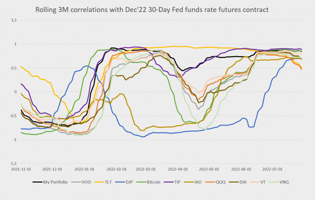 Om vi tittar närmare på data, följer nedan också en tabell över respektive ETF:s korrelation med 30-Day Fed Funds Rate Dec’22-kontraktet över sista 12, 6 och 3 månaderna fram till sista juli.