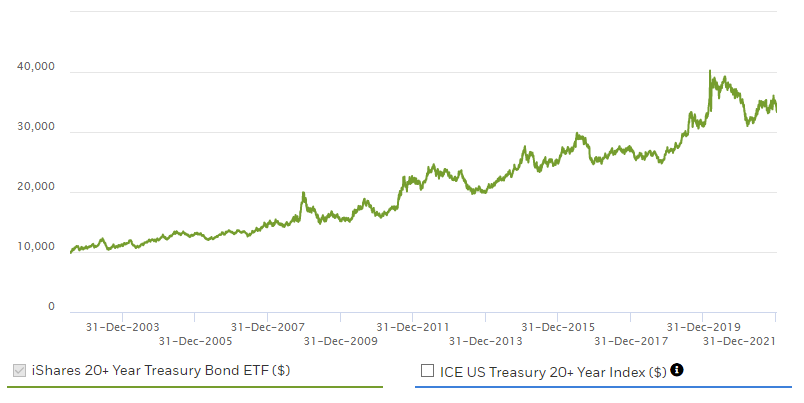 Men först som bakgrund, här är en graf över populära ETF:en TLT (amerikanska varianten av IS04) (iShares 20+ Year Treasury Bond ETF) sedan den sjösattes för snart 20 år sedan: