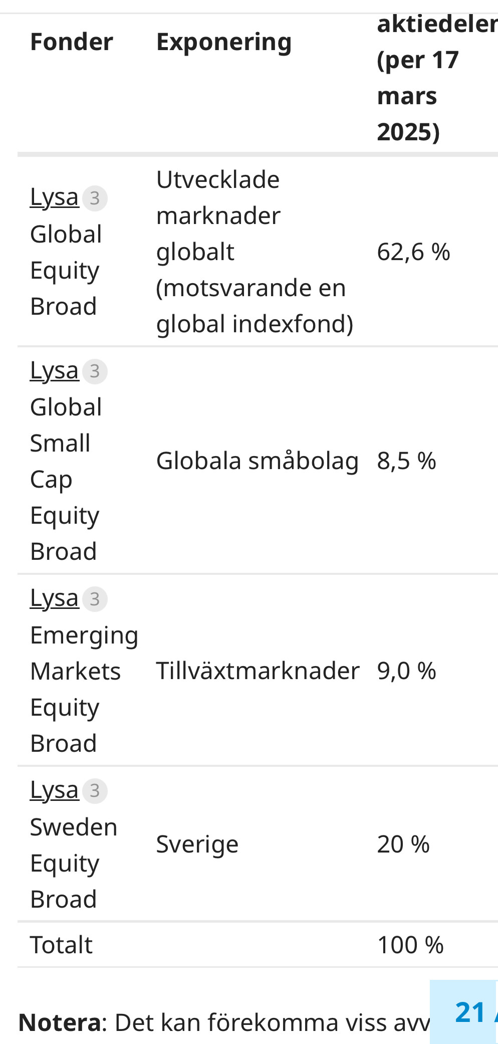 Har varit sugen på att prova LYSA då jag vill ha ett lätt form av sparande över tid. Har tänkt att jag skulle vilja ha ca 70% indexfond, 20% sverigefond och kanske 10% högrisksparande. Efter att ha fyllt i några enligt mig ganska breda frågor fick jag förslaget 30% räntefonder och 70% aktier. I själva “aktieblocket” verkar det finnas både indexfond och sverigefond. Men det är inte tydligt hur dessa fördelas över tid. Alltså tycker jag det blir flummigt att säga att “aktieblocket” är hög risk eller låg risk då de kan utgöras av så olika saker.