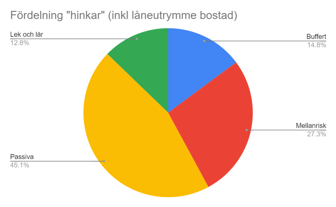 Bostaden tycker jag är lite svårt att veta hur man ska ta med, men jag tänker mig att utrymmet i skillnaden mellan aktuell belåningsgrad (just nu 59 %) och de 75 % som vi kan låna upp till på Landshypotek är en del av mellanriskhinken, eftersom det t ex skulle gå att nyttja detta vid en större skada på huset eller liknande utan att behöva inkräkta på det långsiktiga sparandet (men försämra ränterabatten på hela bolånet, som hos Landshypotek är bäst < 60 % belåningsgrad).