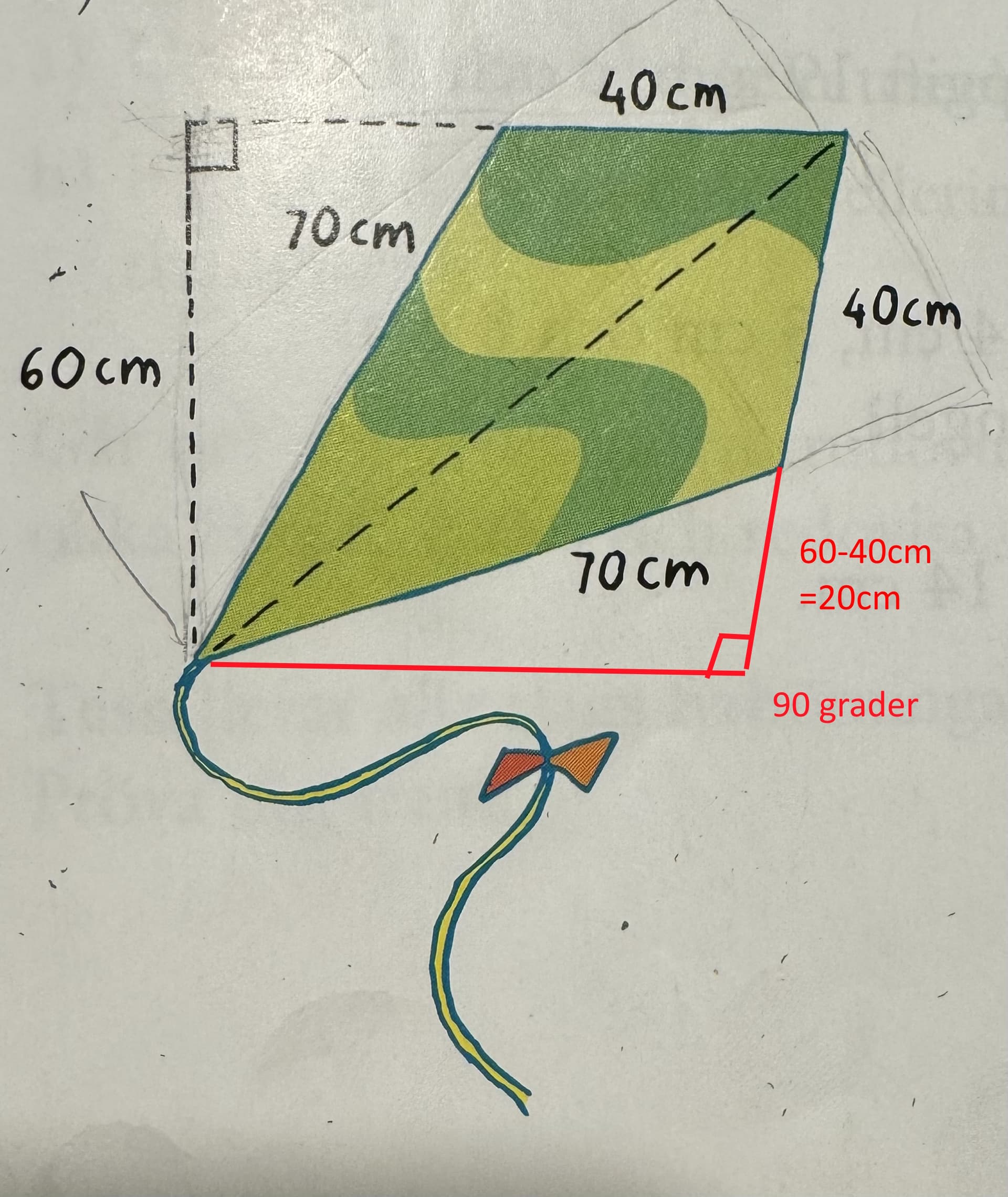 Sidorna är lika långa, så den måste vara symmetrisk. De har bara ritat den snett för att luras. Är det 90 grader i ena hörnet är det 90 grader i andra. Då kan man räkna ut basen 20 cm på det som inte är en del av draken.