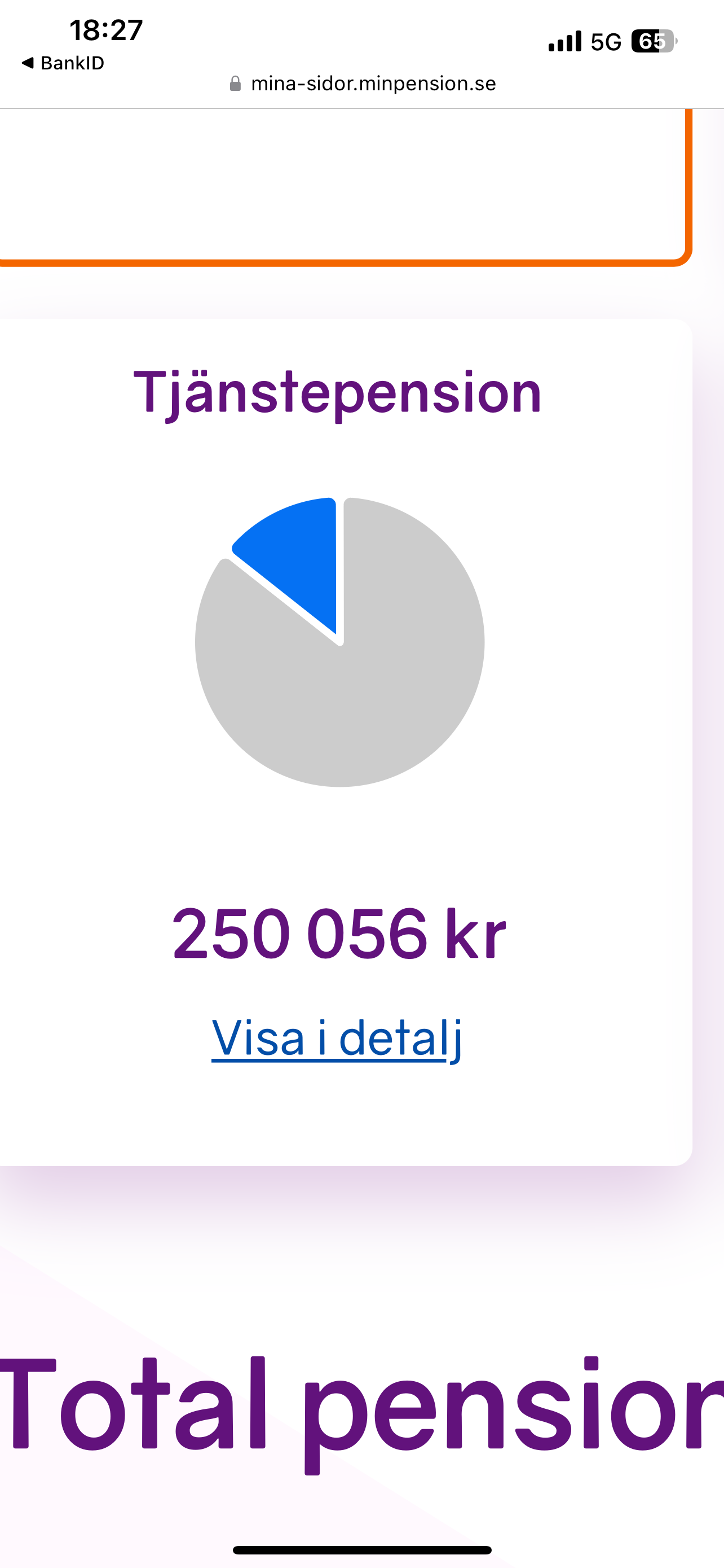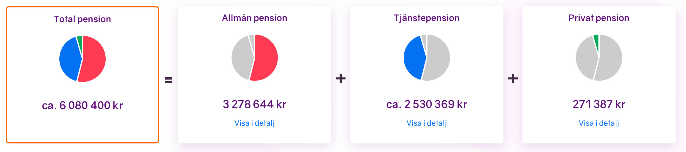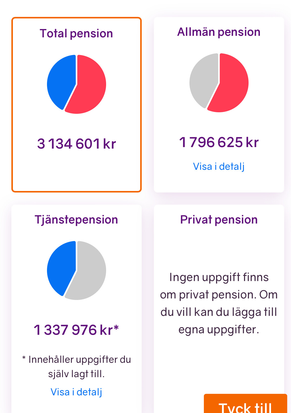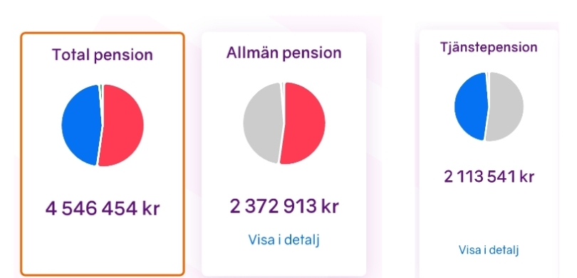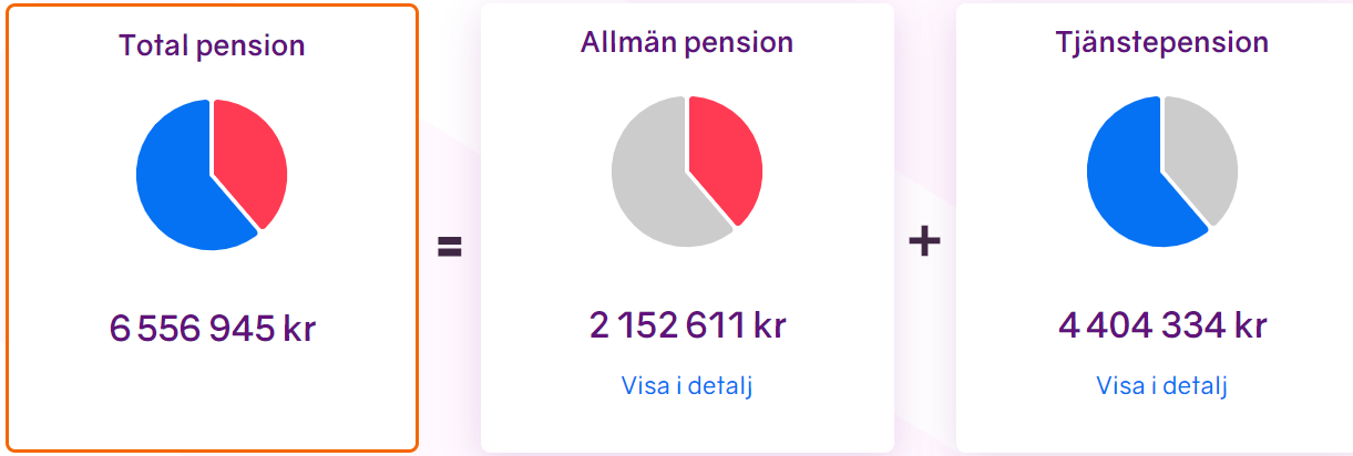 Jo, det har jag hittat men jag vill se summor. Det står bara att jag kommer få bättre pension än x procent av befolkningen. Jotack det visste jag redan. Är höginkomsttagare, det var ingen nyhet för mig. Vi mest veta för att bestämma mig för om jag ska trycka in min årliga bonus i tjänstepensionen (tjänar över brytgänsen och företaget sätter in de extra % de sparar).