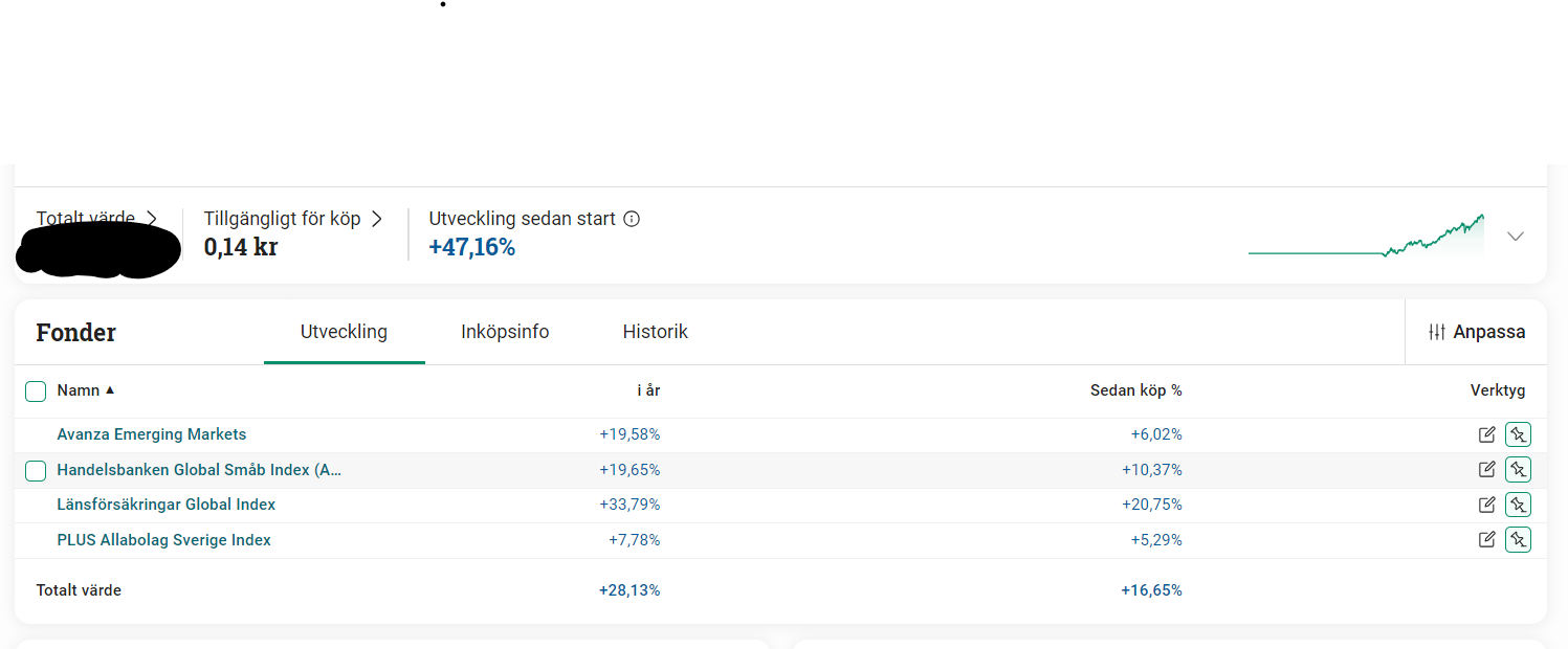 Fattar fortfarande inte, sorry. För att veta utveckligen i % bör vara (totala värde-periodens instättningar) /periodens insättningar=utveckling i procent. Då stämmer sedan start i %. Samma missvisade på Lysa. Där står sedan start 40 men egentligen 22%