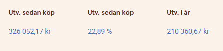 De pengar du har haft investerade har ökat med 47% under perioden. Men under en del av tiden så har det varit ett mindre kapital. 47% kan du använda för att jämföra med andra investeringar.