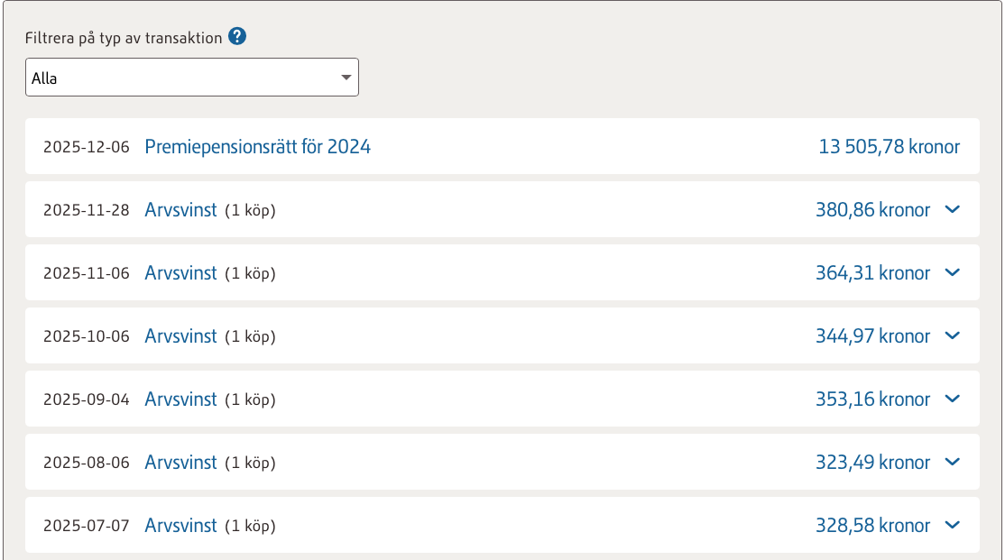 Skall själv starta uttag av allm.pensionen någon gång under nästa år (64år) men kollade även på hustruns siffror. Hon har fått ut 4 818 kr/mån i premiepension under året och hade vid ingången av året 1 302 837 kr. Nu har hon efter 11 utbetalningar 1 300 930 kr kvar och värdeförändring i år har hittills varit +4,4%.