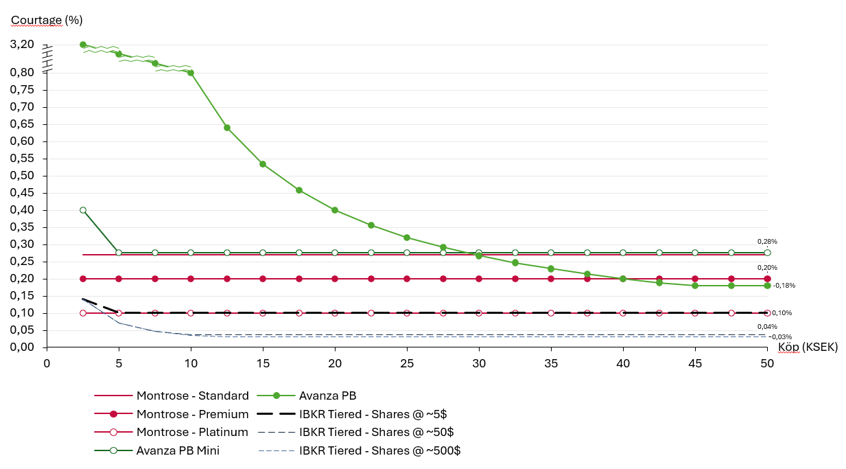 Aha, aktiebiten visste jag inte om, antog att det definierats samma som för ETF:er som på IBKR. Avanzas är 0,125%, men som sagt är grafen ändå utifrån deras prislista. Dock är deras utbud väldigt kasst just nu, så ingen idé att hoppa dit för aktier (ännu).
