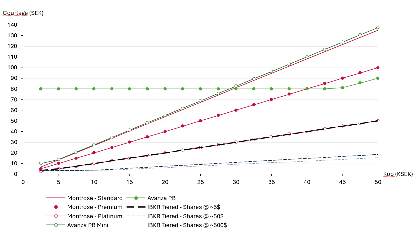 OBS att i dagsläget är Montrose sämre än Avanza PB Mini, och endast bättre än Avanza PB i första halvan av denna graf (~25k SEK) iom växlingsavgiften är 0,3% i dagsläget och inte det som planerats enligt hemsidan för varje nivå.