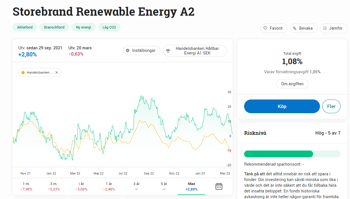 Jag sitter idag med en investering på ca: 100.000kr i fonden - Handelsbanken Hållbar Energi. Placeringen utgör ungefär 6-6.5% av portföljens värde och bör ses som en del av lekhinken. Jag är dock intresserad av ett billigare alternativ och gärna en passiv fond som följer index inom hållbar energi. Finns detta att köpa?