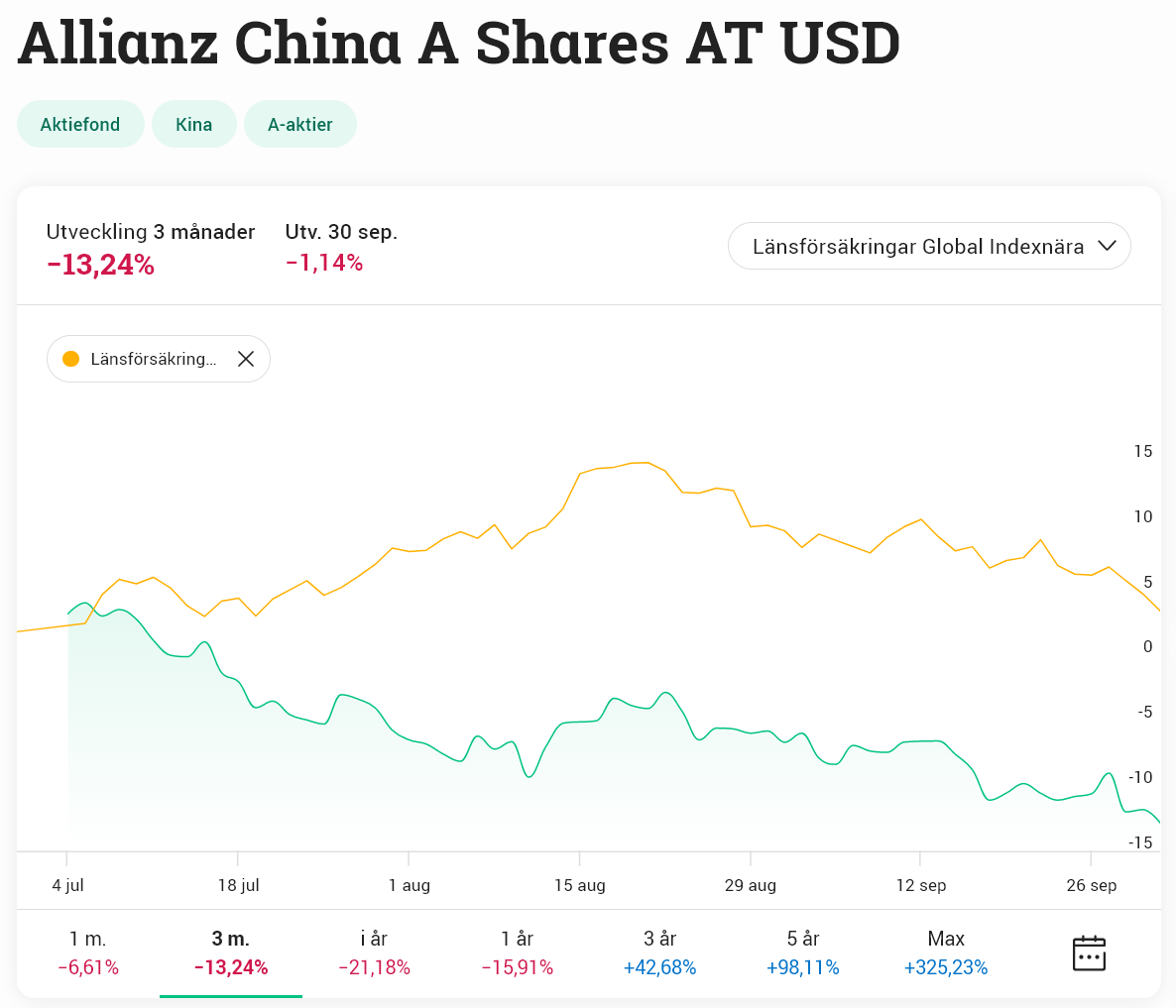 Sorry, du har redan missat din chans. Enligt den rådande kinaexpertisen på forumet så inträffade nämligen det perfekta läget att gå all in i Kina redan i juni. Västvärlden skulle då gå upp i rök samtidigt som Kina helt uppenbart var på väg att vända. Hade du följt det rådet i stället för att bara sitta och trycka med LF Global som någon annan loser så hade du fått äran att ta del av den här fantastiska utvecklingen: