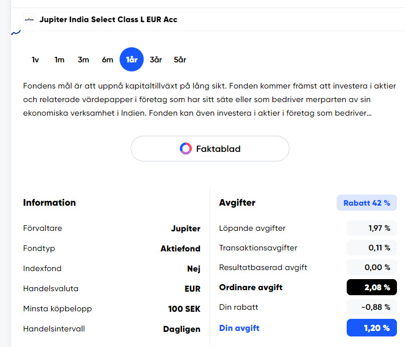 Det skiljer 1,2% - 0,2% = 1% i avgift mellan Jupiter India och Franklin FTSE India, förutsatt att fonden köps på Fondo.