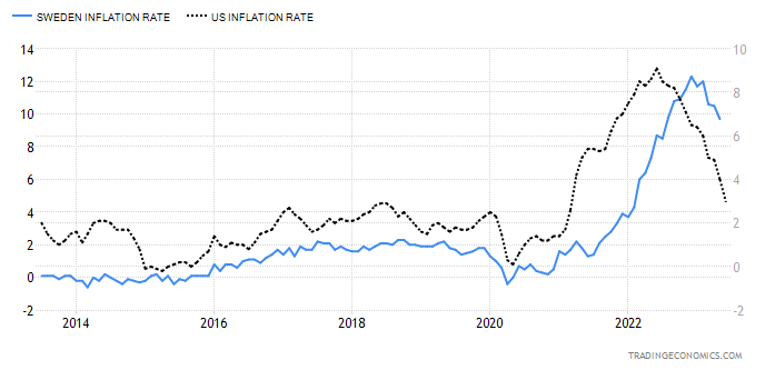 Kanske inte helt 100% rättvisande då jag inte lyckas plotta det mot samma Y-axel med mobilen, Svensk inflation på vänstra Y-axeln och USA på högra. Men det visar ändå att vi ligger ett gäng månader efter USA och har gjort det hela cykeln.