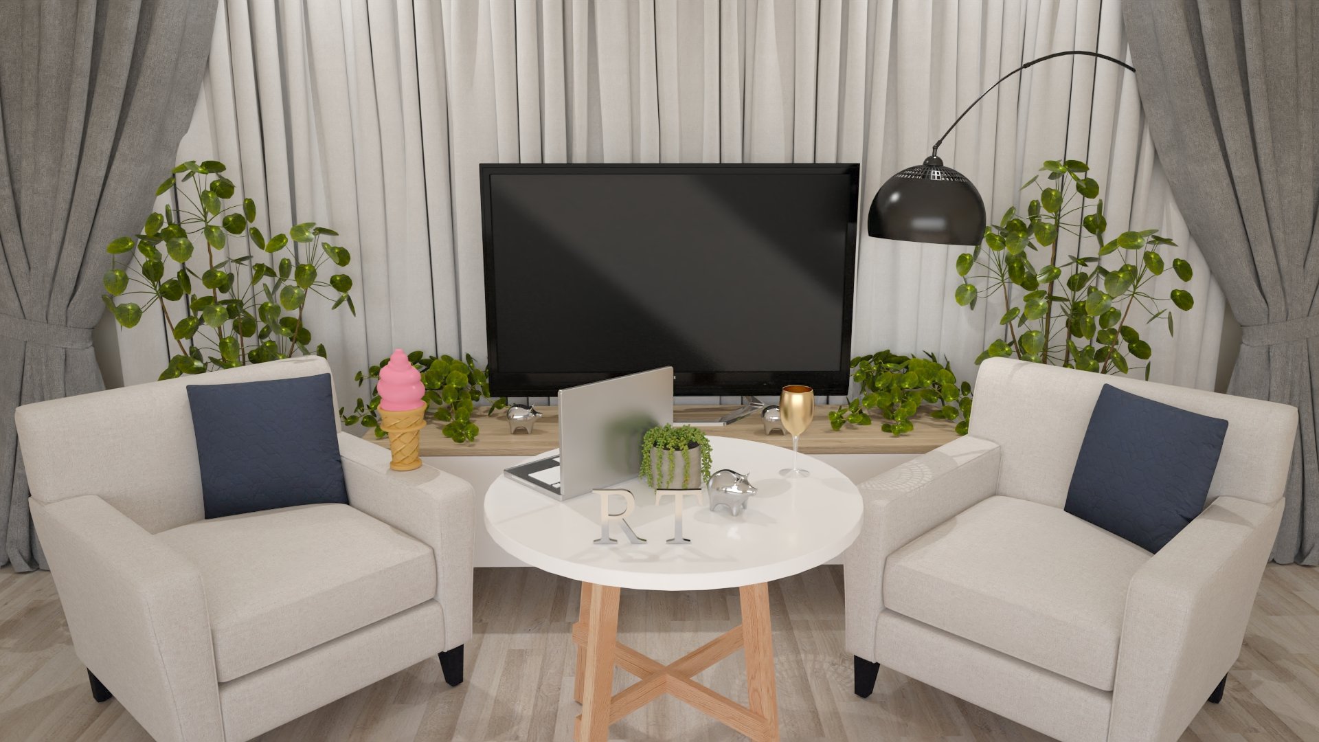 Det verkar enklast att ha en minimalistisk studio med greenscreen. Och sen införa en funktion där tittaren själv kan lägga på digital inredning efter egen smak.