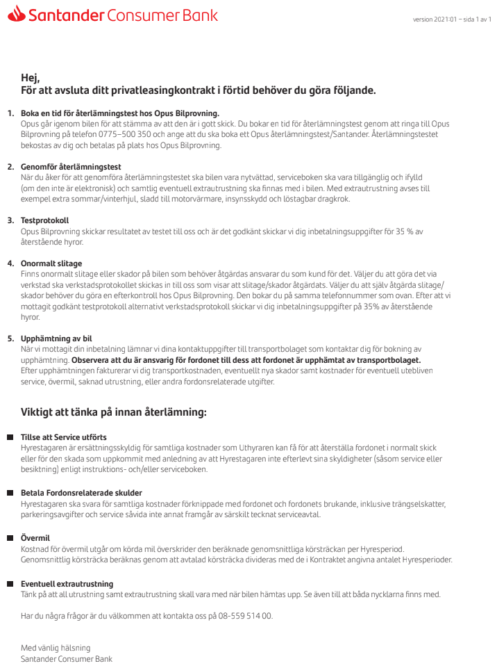 Instruktion för förtidslösen av leasingkontrakt från Santander: