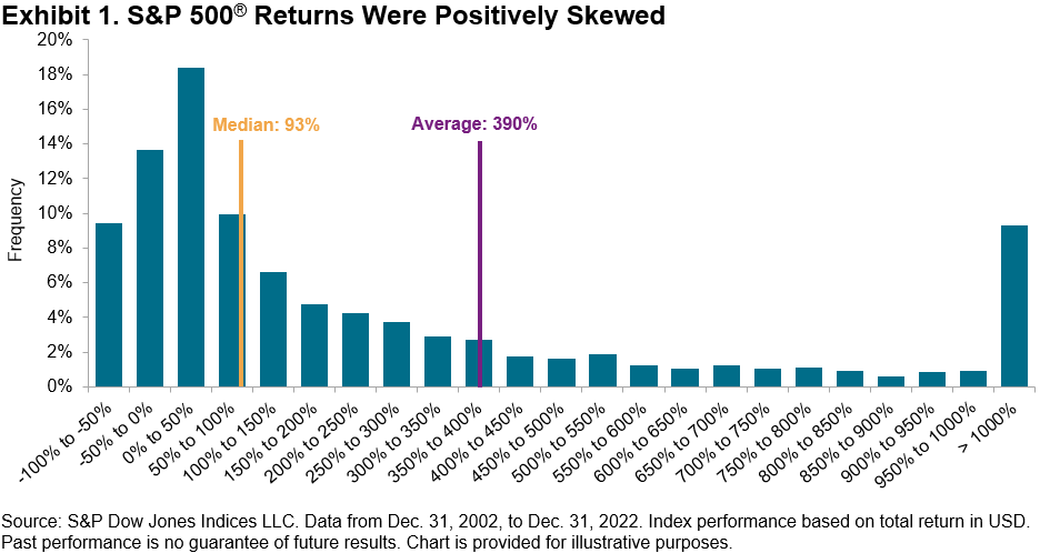 concentrating equity positions raises the probability of underperformance. One of the most consistent characteristics of global equity markets is that returns are positively skewed—when graphed, they have a long right tail, as shown in Exhibit 1. This is intrinsically logical, since a stock can only lose 100%, but has unlimited upside.