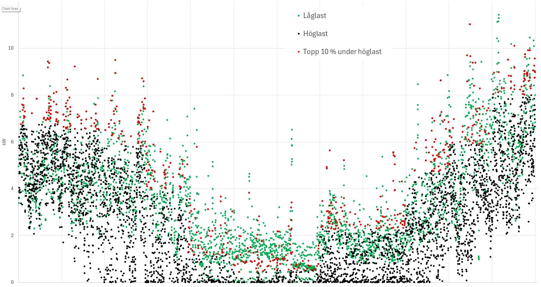Tittar man på ett års timmar så ser det ut som nedan, dvs kapar jag de 10 % högsta topparna (röda prickar i grafen nedan) varje månad borde det gå att få ner detta med åtminstone 2-3 kW per månad och spara 180-270 kr/mån.