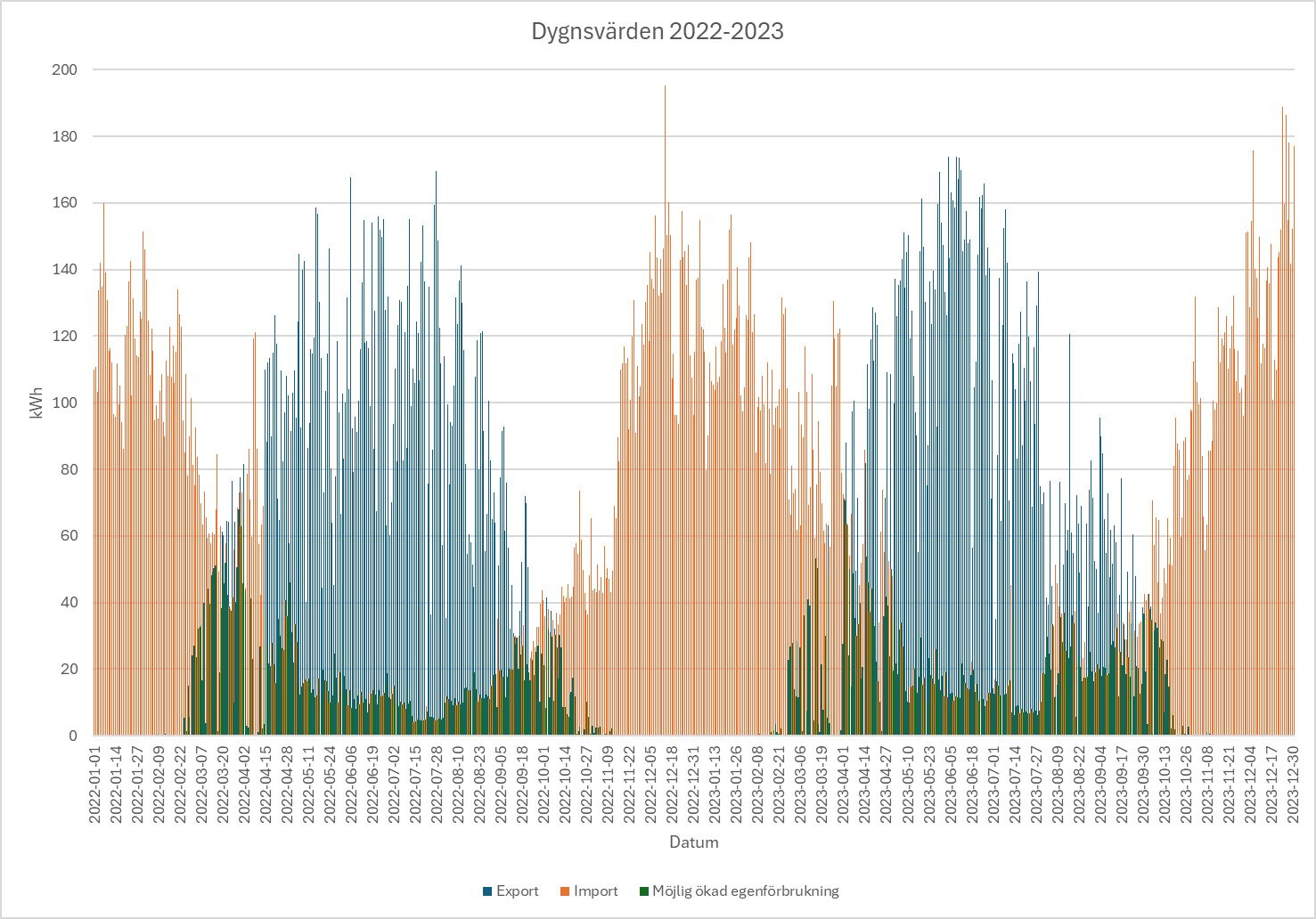 Här får man räkna utifrån sina egna förutsättningar, men går jag på mina egna dygnsvärden ett par år (senaste åren det inte var driftstörningar på solelen…) så ser det ut såhär för köpt/såld el. Det gröna är potentialen per dygn, dvs hur många kWh som både exporteras och importeras samma dygn. Potentialen är faktiskt högre höst och vår, mitt i sommaren kan man lättare helt gå över till egenförbrukning med en anläggning av vår storlek.