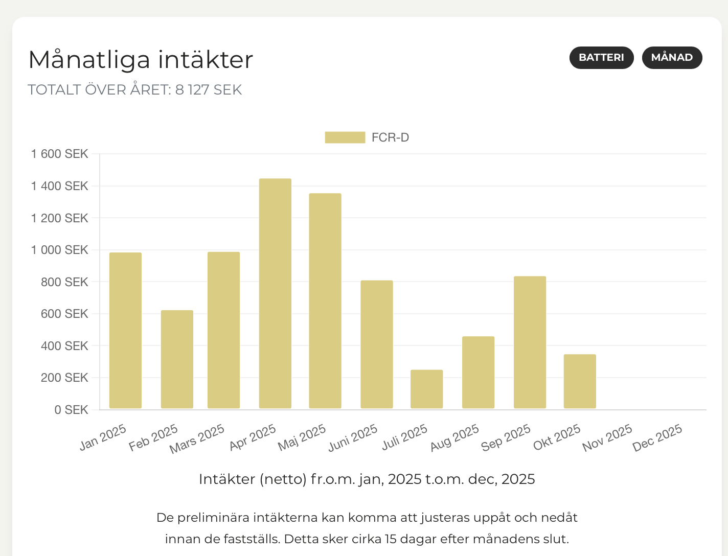 Här har jag inte vågat anta nåt värde på det, men ser det som en uppsida om man t ex via Tibber eller nån annan extern leverantör av styrning skulle kunna vara delaktig på nya stödtjänstmarknader i framtiden, även om de kanske även då blir kortvariga innan marknaden hamnat i balans.