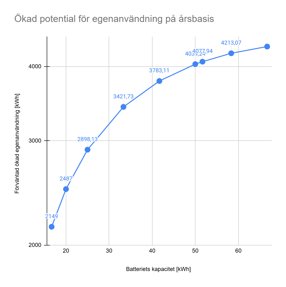 Detta är en viktig analys för dimensioneringen av batteriet. Inledningsvis ger fler kWh bra utdelning, men det är en avtagande nytta.