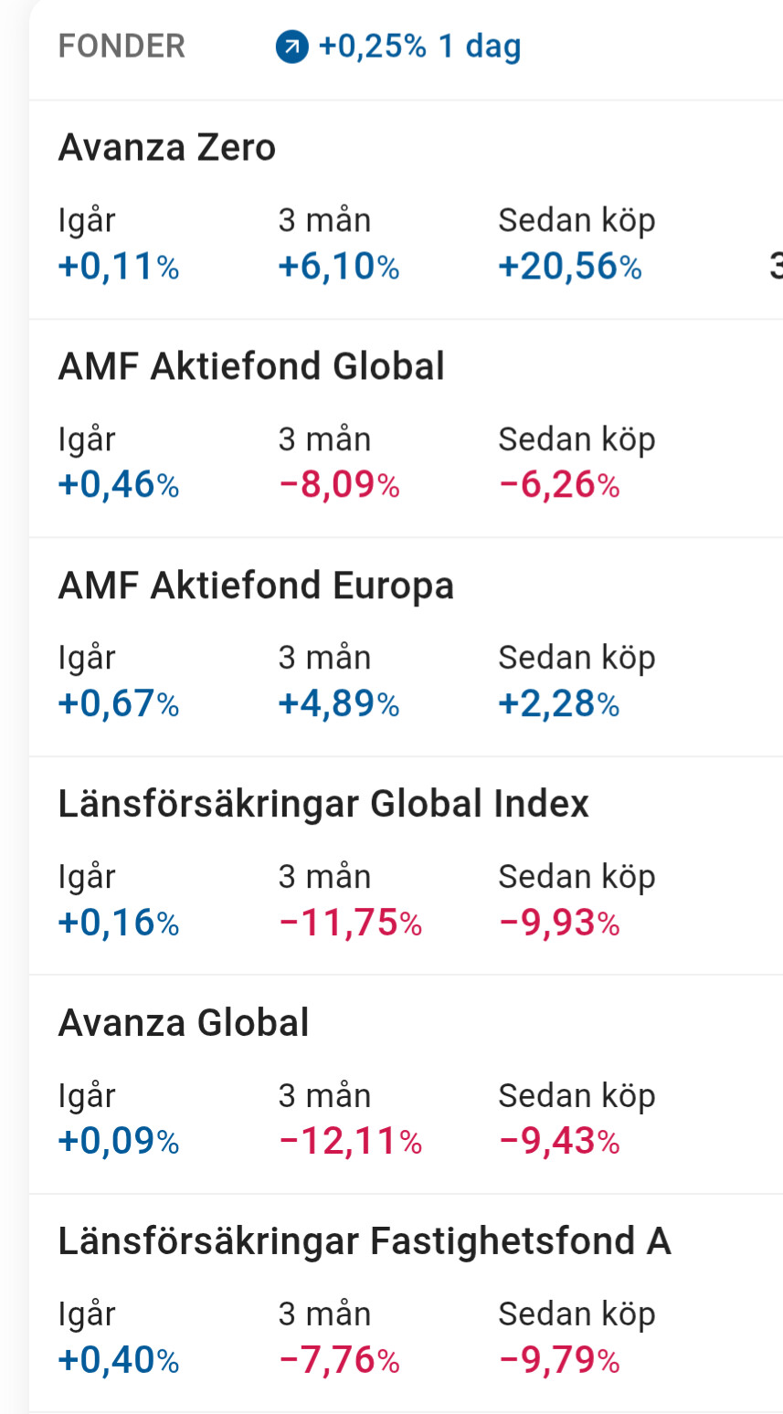 Vilka fonder har du idag? Personligen har jag globala indexfonder, men jag har, återigen personligen, valt att övervikta Sverige.
