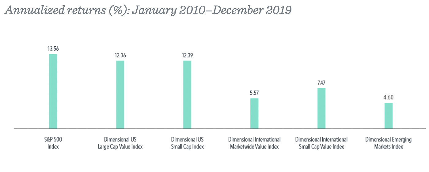 Yet it was a good decade for investors who diversified their holdings globally beyond US large cap stocks and included other parts of the market with higher expected returns—companies with small market capitalizations or low relative price (value stocks).