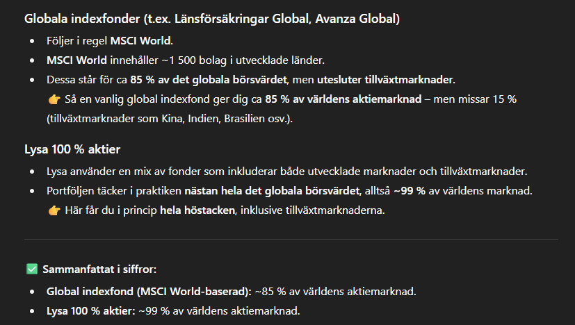 Ja har du 100% aktier så kan du välja en global indexfond istället. Du betalar högre avgift på Lysa och får tillväxtmarknader samt 20% Sverige.