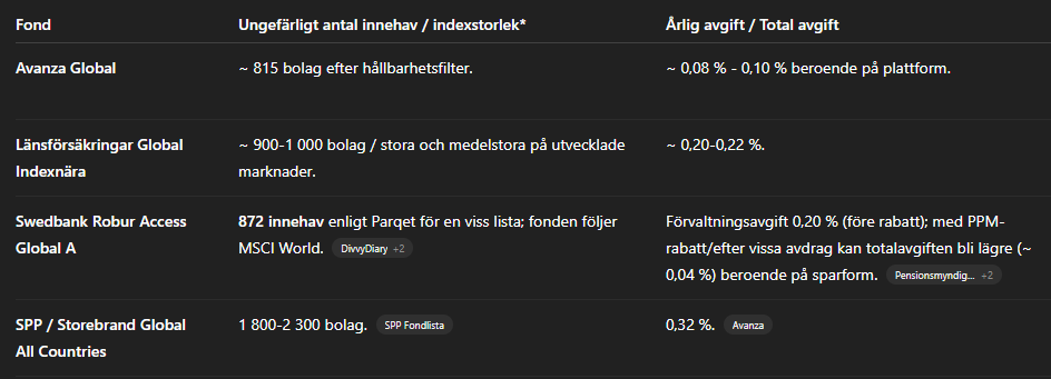Här är fyra globala indexfonder som brukar rekommenderas Länsförsäkringar Global Index, Avanza Global, DNB Global Indeks S, Swedbank Robur Access Global A.