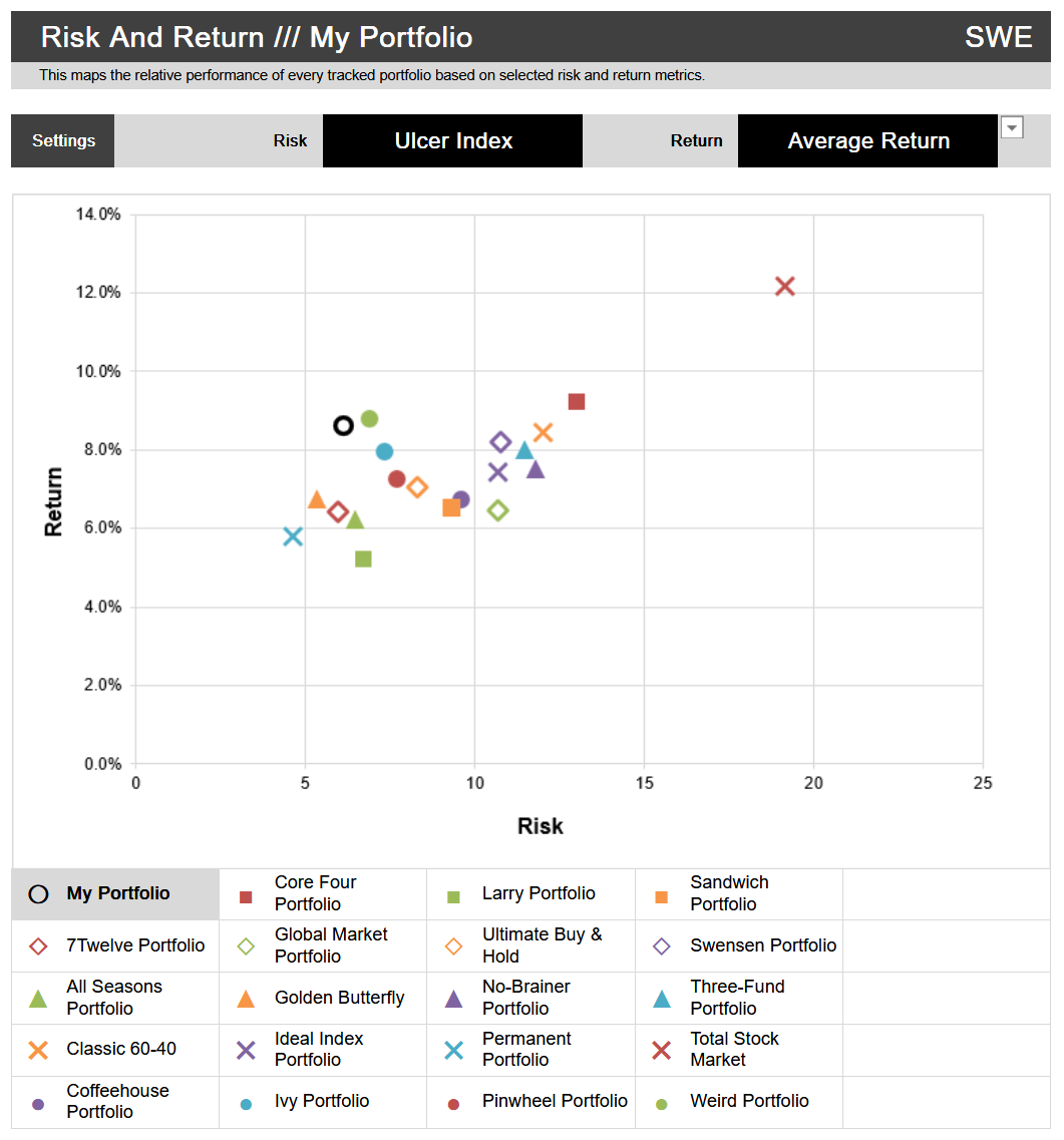 Det hela ökar volatiliteten i portföljen med runt 2%, och Ulcer Index (djup och lĂ€ngd pĂ„ historiska drawdowns) frĂ„n drygt 5 till drygt 6 (en relativt liten förĂ€ndring). Mer data under âbacktestâ.
