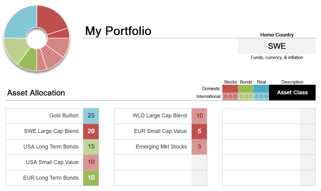 Portföljen delar vidare upp aktierna i 20% svenska aktier, 15% small cap value, 10% momentum samt 5% tillvÀxtmarknader.