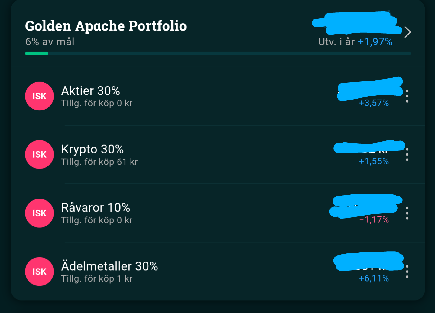 Fortsatt stor andel krypto - primärt bitcoin - men det är för att jag ville ha det oavsett, man skulle ju kunna argumentera för att ta bort dem helt och ha dem utanför portföljen separat men ah - blir ju mer som mental bokföring då och jag tänkte det är roligt att ha med de i samma portfölj för att kunna vara med och ombalansera och se hur det utvecklar sig.
