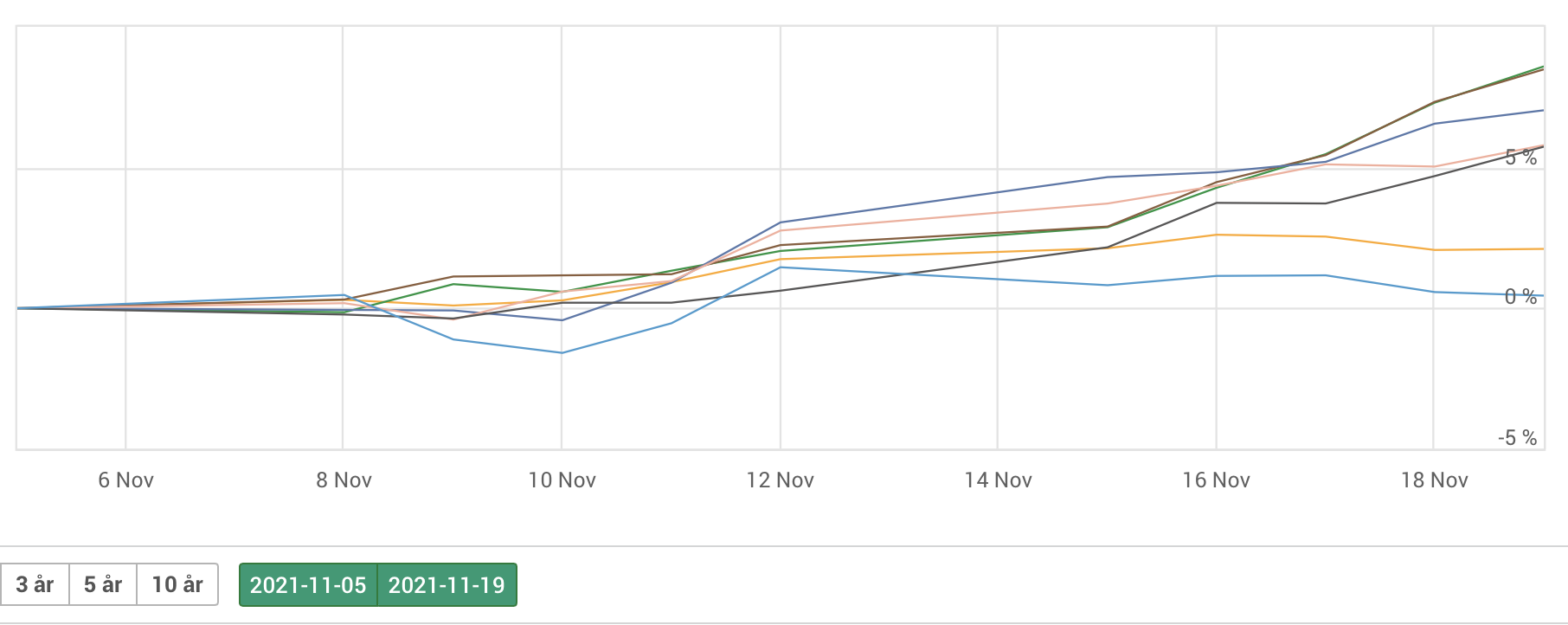 Exempel. Efter att ha studerat ett antal alternativa val i PPM är man nere på 6 fonder, en ska bort. Viiken? Se i figuren nedan med 5 fonder med graf på 2 veckor, där den gula är OMXS30 som jämförelse. Vilken ska bort? Jag tar bort den ljusblå längst ner, den ser ut att ha sämre trend än de andra. Håller du med?