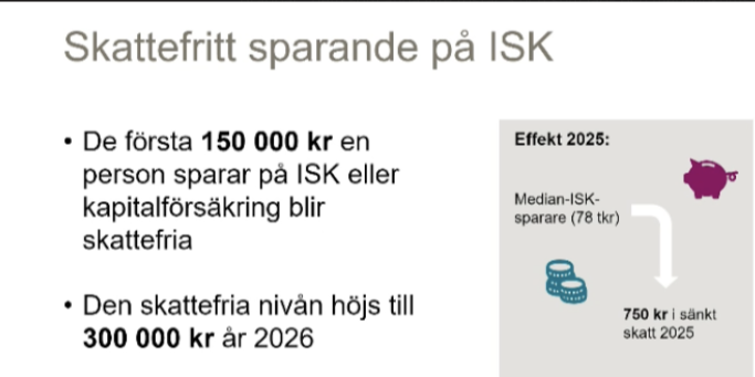 Sedan blir troligen stadslåneräntan i november lägre än 1,84 samt att det troligen blir 300’ skattefritt i botten på ISK-sparandet. Vilket borde ge ytterligare sänkning.
