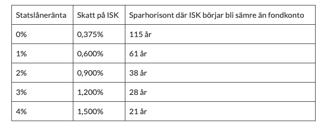 Skattenivån på ISK, som ändras vid årsskiftet, baseras på statslåneräntan den 30 november varje år. Skatten beräknas sedan efter en formel där man tar statslåneräntan och lägger till 1 procentenhet. Skatten uppgår sedan till 30 procent av det. Nästa års ISK-skatt landar därför på 0,88, mot årets 0,375 procent, enligt DI.