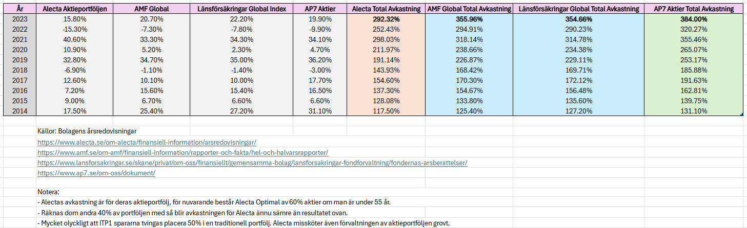 Jag sammanställde avkastningen från 2014-2023, totalt 10 år för Alectas aktieportfölj, Länsförsäkringar Global, AMF Global och AP7 Aktier.
