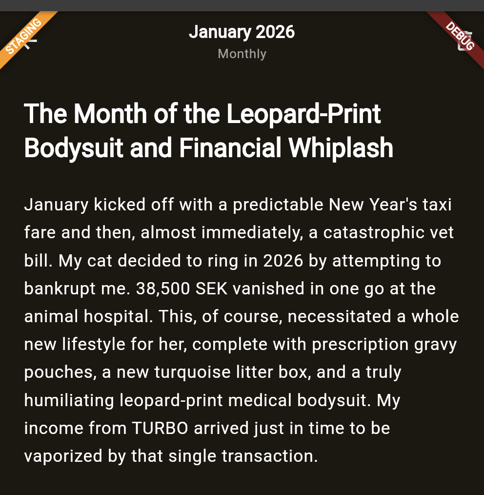 Senaste månaderna har fokus mest varit på spardelen. Jag har precis gjort om mobilvyn lite för spardelen, nu är det ingen tabell som man behövde skrolla horisontellt i. Det var jobbigt. Nu behöver jag städa upp lite i den detaljerade vyn och göra det tydligare. Loggor hade varit trevligt med.