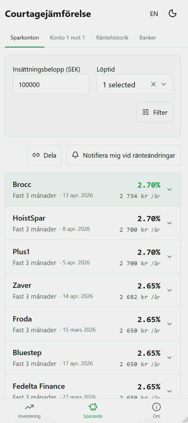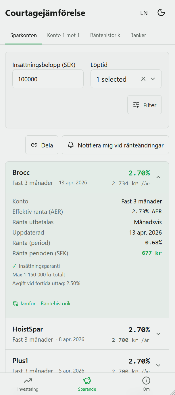 Det går också att skriva in belopp, för det kan påverka vilken ränta man kan få eller om man kan ha pengarna där överhuvudtaget. Funkar inte perfekt, det finns några undantag som jag inte har orkat hantera.