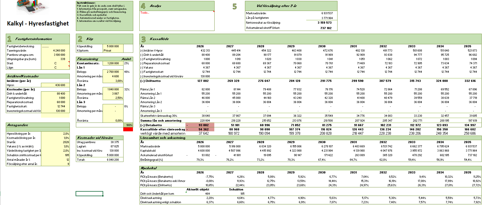 Vad ingår i driftskostnaderna? Uppvärmning, varmvatten, sophämtning, VA-avgifter, OVK kontroll, ev tomträttsavgäld, sotning, försäkringar, snöröjning, elavtal osv. Här kan det skilja MYCKET beroende på geografiskt läge, typ av hyresgäster. (En 3 barns familj kostar betydligt mer än en pensionär som bor själv) Så här ska man nog akta sig för att använda schabloner utan bäst är nog om man kan få fram dagens siffror på det befintliga objektet för att få en vettig uppskattning.
