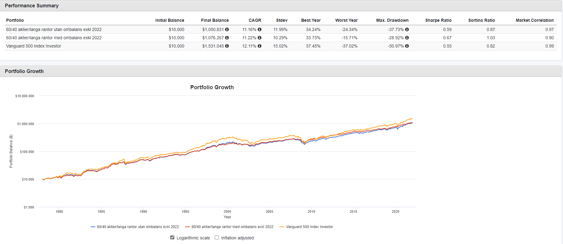 Vi ser att ombalansering inte påverkar CAGR nämnvärt (ca 0,2% lägre), men max drawdown och riskjusterad avkastning förbättras dock avsevärt.