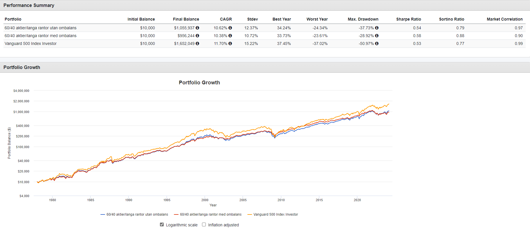 Vi ser att ombalansering ökar CAGR med ca 0,4%-enheter. Tyvärr försämras max drawdown under finanskrisen, men riskjusterad avkastning förbättras.