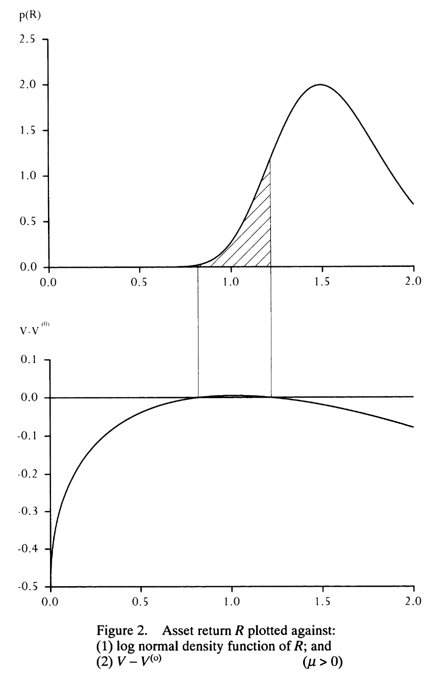 Här ser vi dock istället vad som händer om avkastningen hos den riskabla tillgången är mycket högre än den säkra (hela grafen är förskjuten åt höger). Enbart en minoritet av utfallen (skuggat område) i övre grafen ger högre avkastning vid ombalansering.