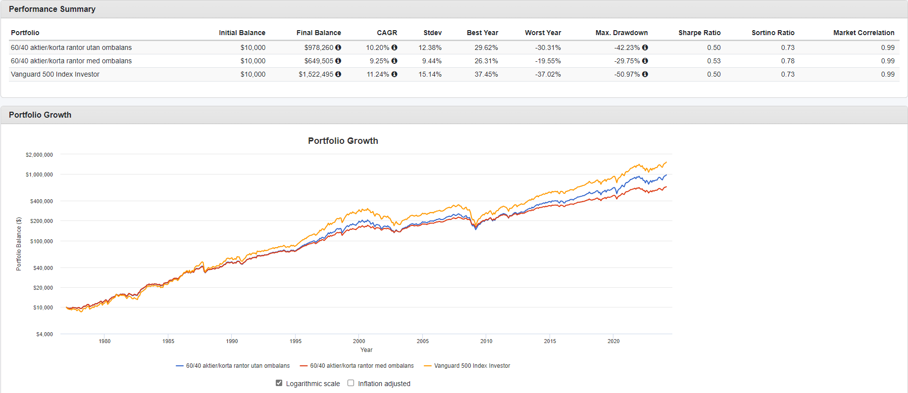 I praktiken skulle detta alltså innebära att ombalansering mellan t.ex. aktier och räntor inte lönar sig, eftersom skillnaden i förväntad avkastning är stor. Ett naivt sätt att bekräfta detta empiriskt är att backtesta en 60/40-portfölj med aktier/korta räntor, med ombalansering kontra buy-and-hold: