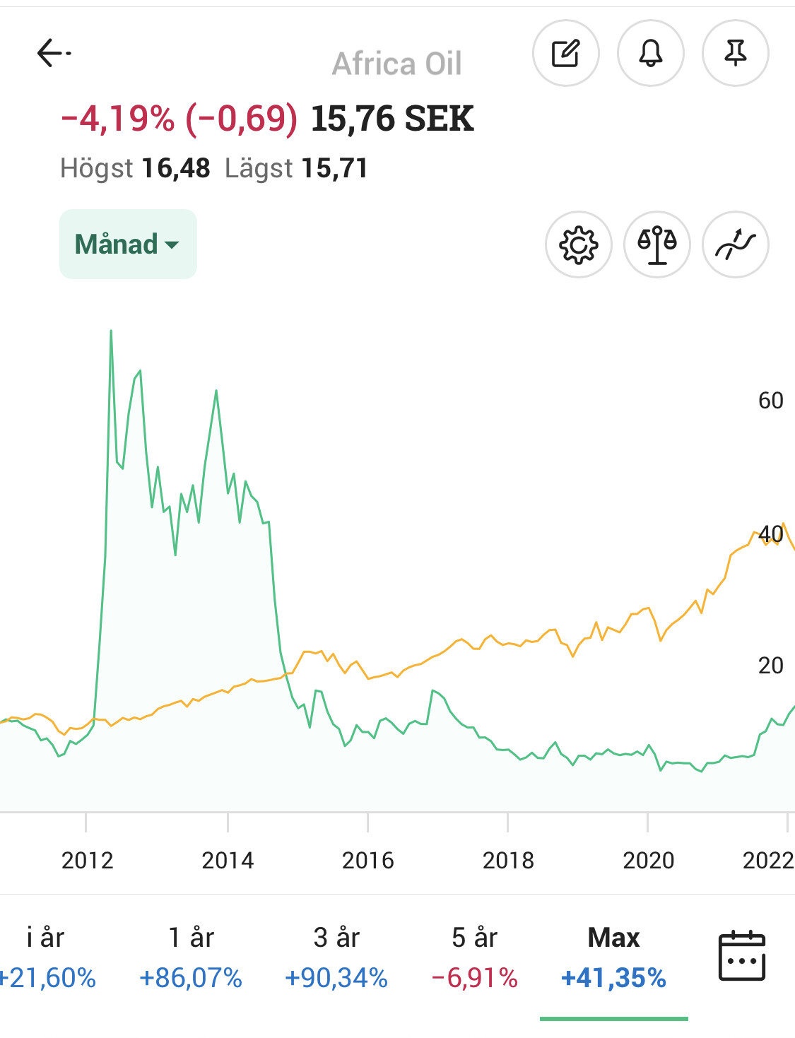 Många har vi varit där, köpte själv in mig i Africa oil någonstans nära toppen 2012, bergsäker på att peak oil skulle få den att skjuta i höjden kommande decennie ![]()