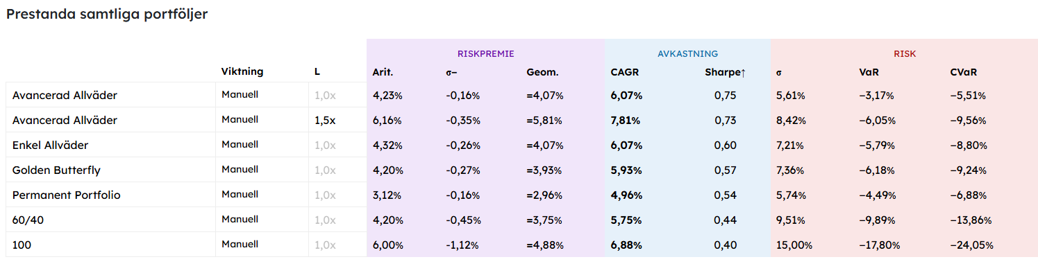 Ex-ante beräkningar på grundportföljen, avancerade portföljen (med och utan belåning), samt andra populära allvädersportföljer.