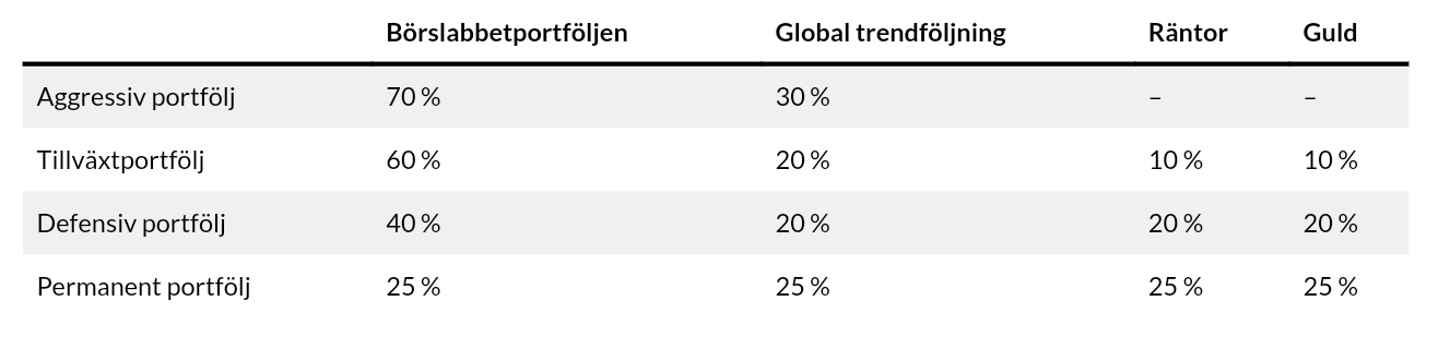 Börslabbets allvädersportfölj består av 25% aktier, räntor, guld och trendföljning.